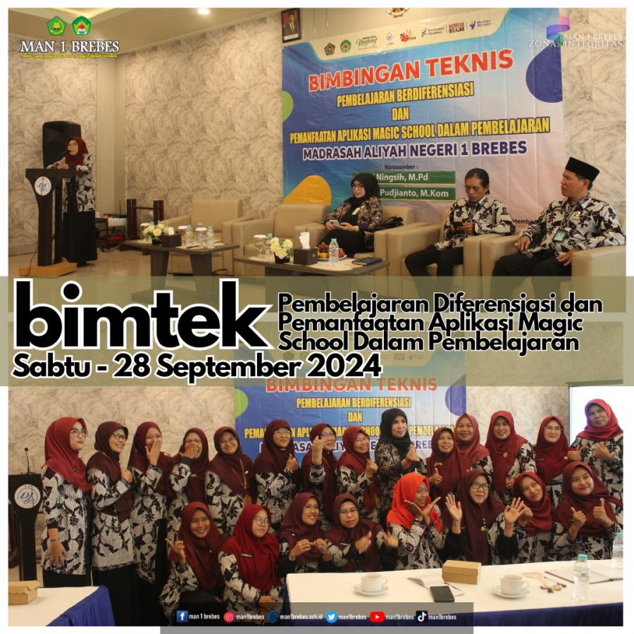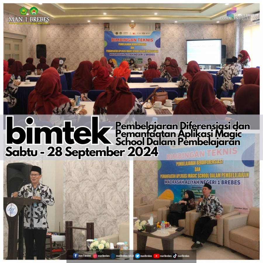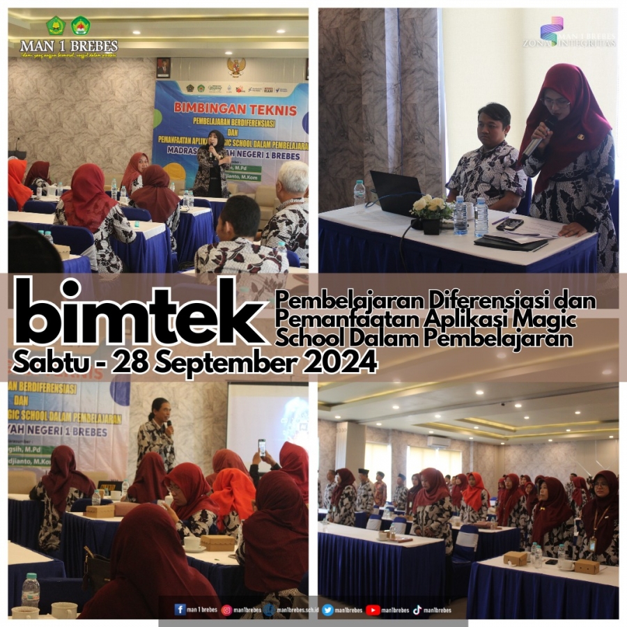 Brebes (MAN 1 Brebes) – Pada Sabtu (28/9/24) MAN 1 Brebes menggelar kegiatan Bimbingan Teknis (BIMTEK) dengan tema “Pembelajaran Berdiferensiasi dan Pemanfaatan Aplikasi Magic School dalam Pembelajaran". Acara ini dihadiri oleh seluruh tenaga pendidik dari berbagai bidang studi, dengan tujuan meningkatkan kompetensi guru dalam menghadapi tantangan pendidikan di era digital dan penerapan kurikulum merdeka.