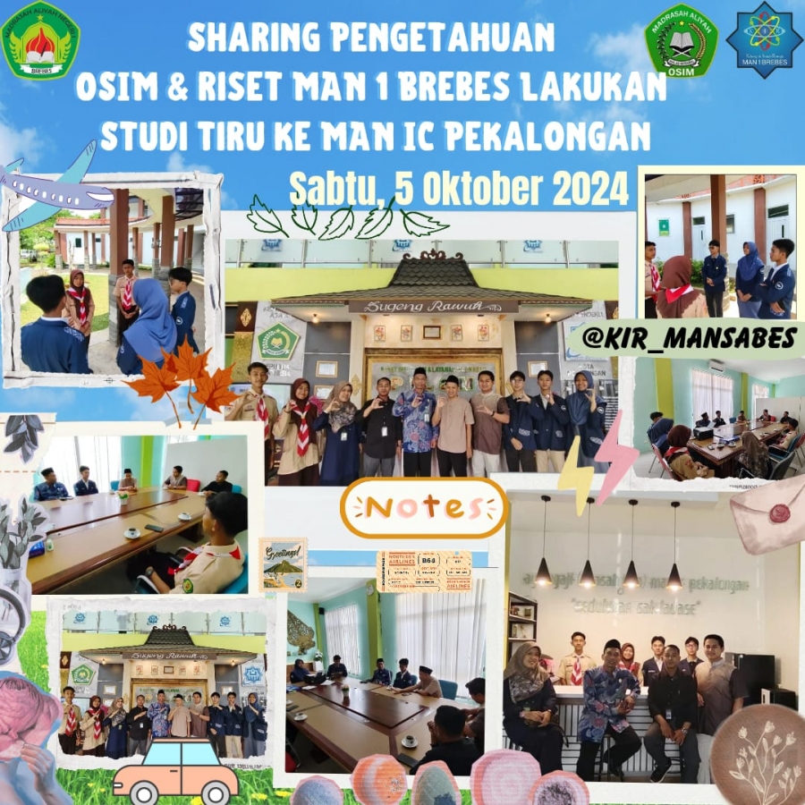 (5/10/2024) Pada kesempatan kali ini MAN 1 Brebes melaksanakan Studi Tiru ke MAN IC Pekalongan. Sesuai dengan namanya Studi Tiru MAN 1 Brebes meniru/mengadopsi gaya belajar MAN IC Pekalongan. Tujuan dari Studi Tiru ini tidak lain dan tidak bukan adalah untuk meningkatkan kualitas pembelajaran di MAN 1 Brebes lebih baik lagi. Pertemuan yang dilakukan hari ini membahas berbagai sistem program kerja dari masing-masing madrasah dan pengenalan satu sama lain tentang OSIM masing-masing. Pertemuan diawali dengan sharing-sharing mengenai struktur, latihan rutin dan juga sistem kas. Pembahasan dilanjutkan dengan berkeliling sekitar MAN IC Pekalongan. Sembari berkeliling, pembahasan dilanjutkan dengan membahas even-even apa saja yang ada di masing-masing madrasah serta sharing tentang sistem kerja event tertentu agar berjalan dengan baik. Seperti pada saat perbincangan membahas mengenai seksi bidang antara Ketua OSIM MAN 1 Brebes dengan Khanza Ketua Umum OSIM MAN IC Pekalongan, ternyata ada perbedaan nama dan jumlah, begitu juga ada perbedaan yang terdapat pada sistem struktur organisasi yakni di MAN IC Pekalongan menggunakan sistem Ketua Umum, Ketua 1 dan Ketua 2 sedangkan di MAN 1 Brebes menggunakan sistem hanya Ketua dan Wakil ketua. Selanjutnya ada perbedaan sistem uang kas. Letak perbedaannya yakni di MAN IC Pekalongan sendiri untuk uang kas dilakukan 4 kali saja dalam satu periode, sedangkan di MAN 1 Brebes uang kas dilakukan secara rutin pertiap minggunya. Menurut Wakamad Kesiswaan, Andri Agustina, M., Si. P, untuk kegiatan Riset, MAN IC Pekalongan dalam kegiatan KBM, Riset masuk dalam daftar mata pelajaran yang diajarkan di kelas setiap hari meskipun ada ekstrakurikuler Riset. Di MAN IC Pekalongan juga setahun sekali mengadakan program Riset Champ terbuka untuk semua siswa-siswi madrasah aliyah se-karesidenan Pekalongan yang tertarik untuk bergabung. Kegiatannya adalah sharing seputar proposal riset bersama praktisi di bidang penelitian yang nantinya akan ditindaklanjuti dengan kegiatan penelitian . Adapula beberapa organisasi yang baru lainnya di MAN IC Pekalongan seperti mahad yang berfokus untuk kepengurusan asrama karena di sana merupakan madrasah boarding school. Dengan adanya pertemuan ini, terdapat informasi dan ilmu baru yang didapatkan. Tentang apa saja even yang ada dan bagaimana even itu dilaksanakan. (aini salsabila/fauzy/khayla)
