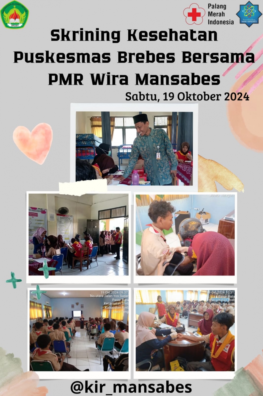 Sabtu (19/10) Puskesmas Brebes berkolaborasi dengan PMR MAN 1 Brebes melakukan Skrining dan Penyuluhan yang bertempat di MAN 1 Brebes. Dilakukannya kegiatan ini berdasarkan disposisi surat no B.400.7.27.2/482/IX/2024 tentang pelaksanaan penjaringan UKS/UKGS dan penyuluhuan kesehatan. Kegiatan Skrining ditujukan kepada seluruh siswa-siswi kelas X yang kemudian diarahkan secara bertahap menuju UKS untuk melakukan Skrining. Kegiatan Skrining meliputi pemeriksaan Kesehatan mulut, gigi, mata, dan telinga. Sementara itu, di meeting room acara Penyuluhan kesehatan yang dihadiri oleh perwakilan siswa-siswi Kelas XI dan XII. Kegiatan dibuka oleh Bapak Ma'mun Khakim, M.Pd. selaku Waka kesiswaan MAN 1 Brebes. Harapan beliau pada acara hari ini seluruh siswa-siswi yang hadir dalam penyuluhan dapat mensosialisasikan kepada teman sebayanya tentang pentingnya kesehatan. Tujuan dilaksanakannya Skrining dan Penyuluhan ini adalah untuk mengecek kondisi kesehatan tubuh seluruh siswa-siswi kelas X dan pembekalan materi untuk siswa-siswi kelas XI, XII. Puncak kegiatan Penyuluhan diakhiri dengan pengecekan tekanan darah dan gula darah siswa-siswi MAN 1 Brebes yang dilakukan oleh tim Puskesmas Brebes dan dibantu oleh PMR. (aini salsabila/fauzy/elisa/tim liputan kir)
