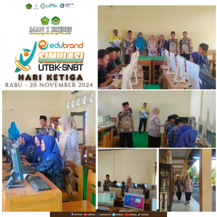 MAN 1 Brebes gelar simulasi Ujian Tulis Berbasis Komputer Seleksi Nasional Berdasarkan Tes (UTBK-SNBT) 2024 yang diikuti oleh peserta didik kelas XII sebanyak 430 siswa, berlangsung tiga hari berturut-turut (18-20 Nopember 2024) bertempat di 3 laboratorium komputer yang terbagi dalam 3 sesi.Peserta disediakan waktu selama 180 menit untuk mengerjakan seluruh soal.