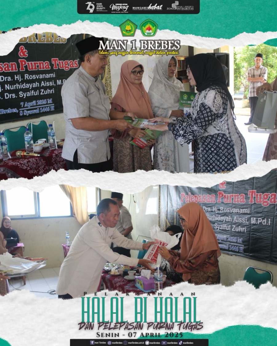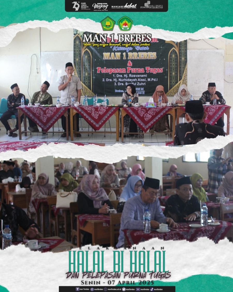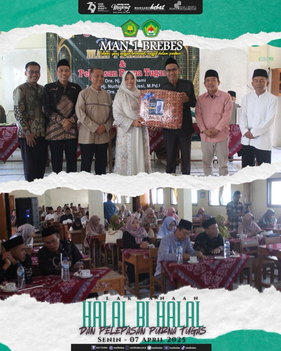 Brebes (MAN 1 Brebes) - Suasana penuh kehangatan dan haru menyelimuti MAN 1 Brebes dalam acara Halal Bihalal yang digelar oleh keluarga besar madrasah pada hari Rabu, 7 April 2025. Acara ini menjadi momen istimewa karena sekaligus dirangkai dengan pelepasan purna tugas tiga guru senior yang telah mengabdikan diri selama puluhan tahun di dunia pendidikan, yaitu Dra. Hj. Rosvanami, Dra. Hj. Nurhidayah Aissi, M.Pd.I, dan Drs. Syaiful Zuhri.
