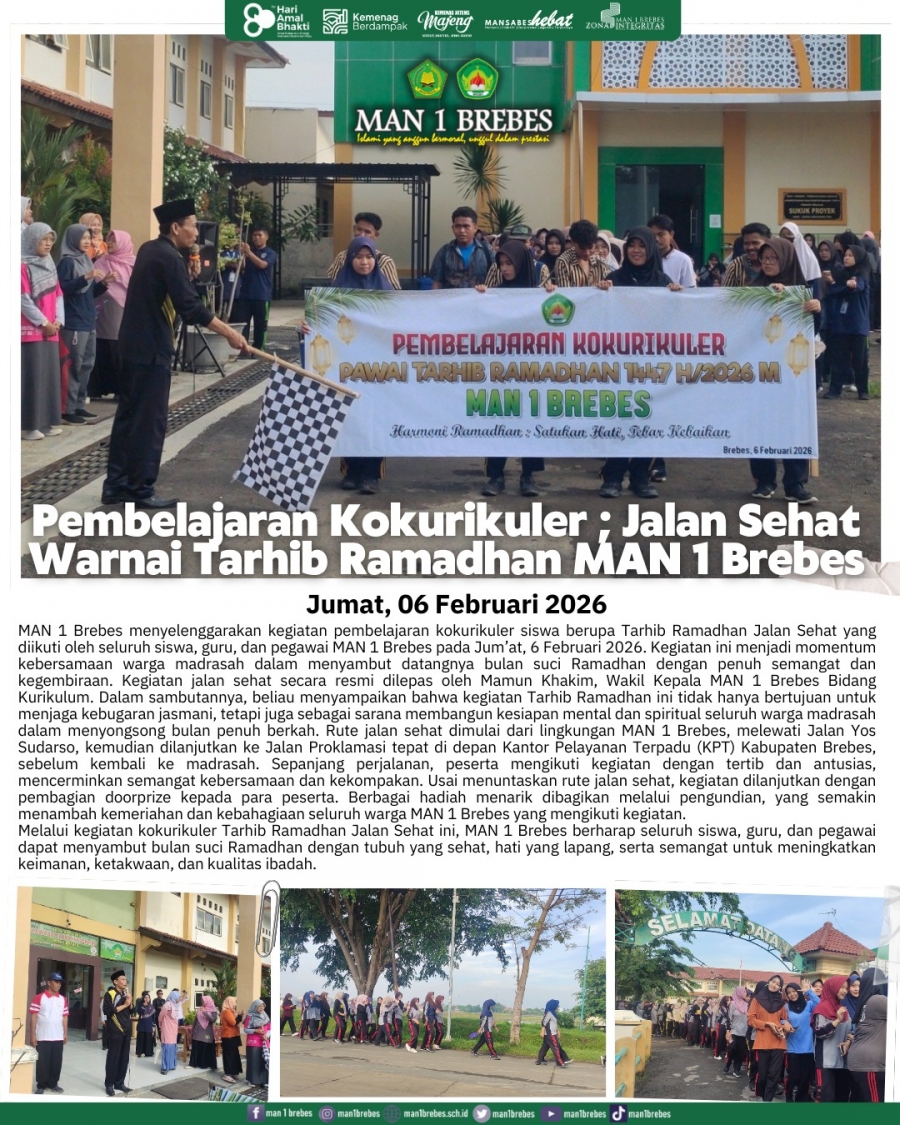 Dalam rangka menyambut bulan suci Ramadhan, MAN 1 Brebes menggelar Tarhib Ramadhan Jalan Sehat pada Jum’at, 6 Februari 2026 yang diikuti oleh seluruh siswa, guru, dan pegawai.